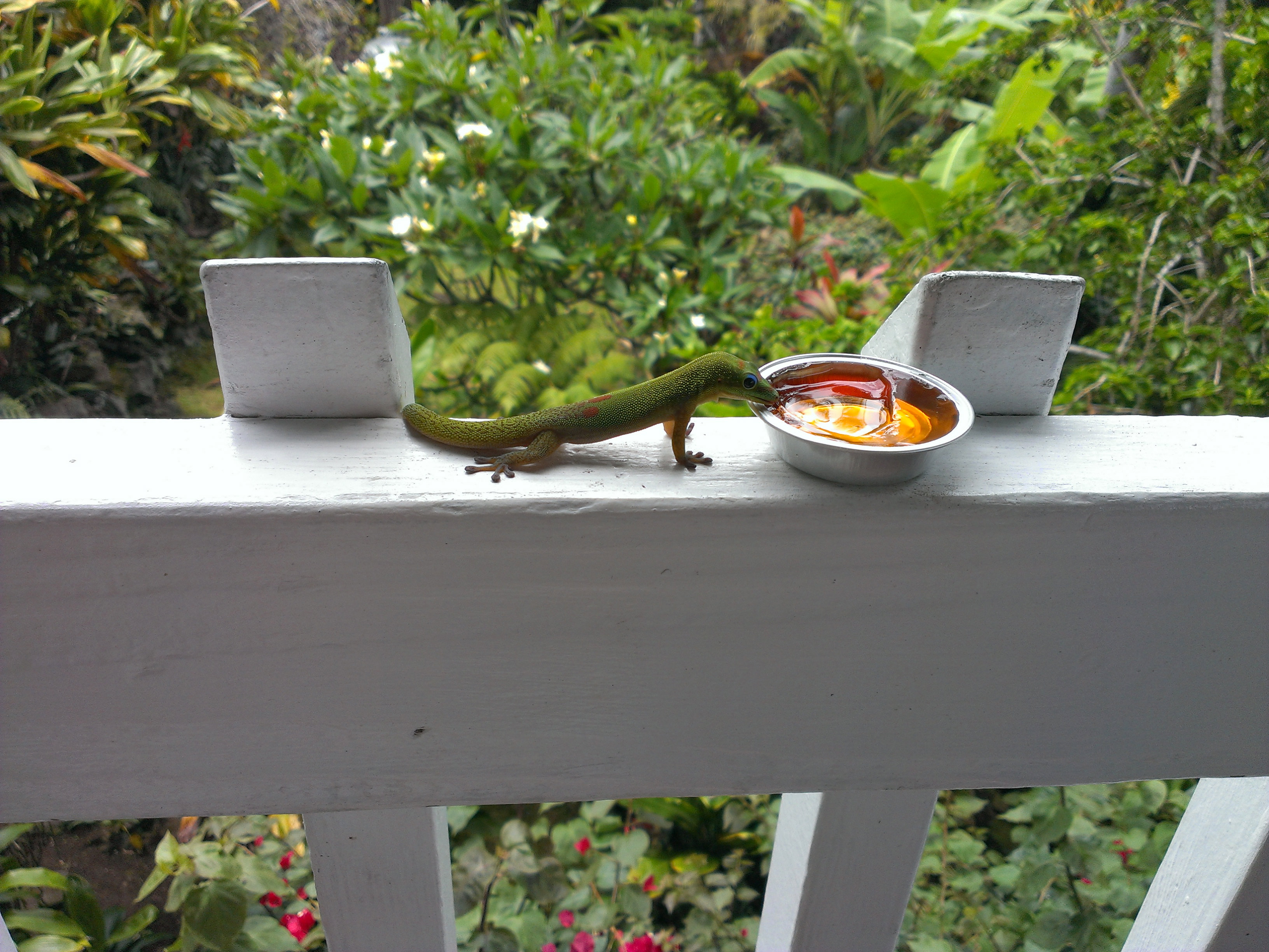 My uncle and I were having lunch at the Coffee Shack in Kealakekua. We ate outside on the patio that was surrounded by tall, beautiful trees with a view of Kealakekua Bay. My seat backed up to a railing and at one point I turned around to look at the view and what did I see instead? A gecko sitting on the railing, calmly eating honey from a small container. I nearly died. I made such a to-do about the cuteness of this sight that other people started turning around to look.