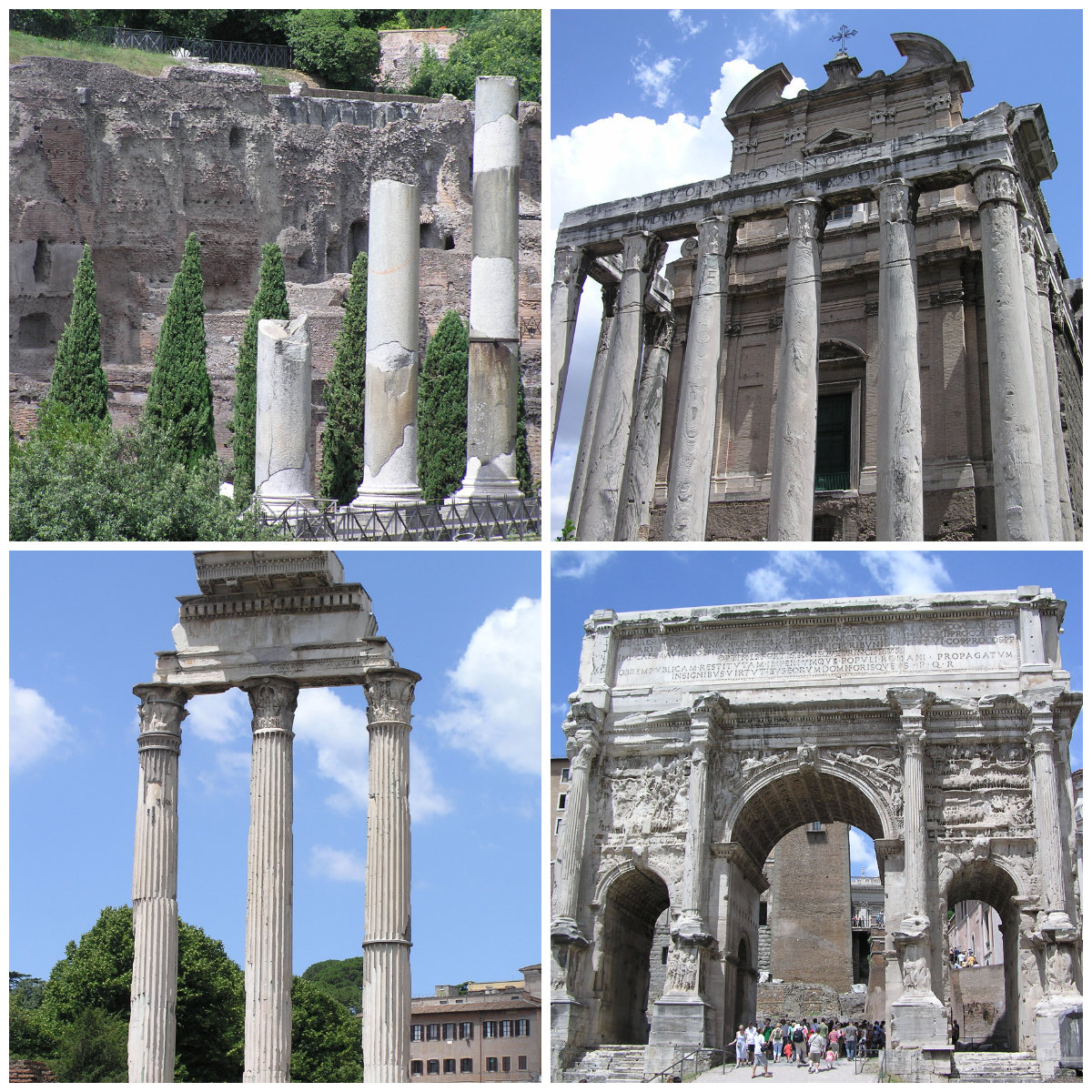 We saw the huge arches of what remains of the Basilica of Maxentius; the Temple of Julius Caesar which is built on the site where his body was cremated; the Temple of Antoninus and Faustina; the remains of the Basilica Aemilia; the Temple of Vesta which was once Rome’s most sacred spot; the House of the Vestal Virgins; the Arch of Septimius Severus; the remaining columns of the Temple of Saturn which is the oldest temple in the Forum; the Column of Phocas…I kept trying to imagine what this place looked like during Rome’s heyday. It’s incredible now, it must have been indescribable then! Makes me wish I had a time machine! 🙂