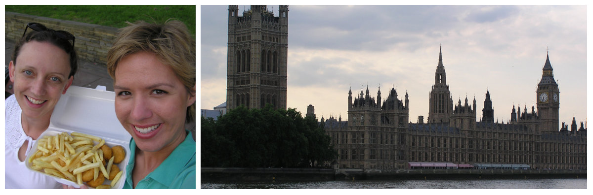 Once back, I changed into comfier shoes and we headed out again to leisurely make our way to the London Eye. We stopped to pick up chicken nuggets and fries from a cafe on the River Thames and sat on a bench eating our dinner with a view of Big Ben and Parliament across the river. Nice.