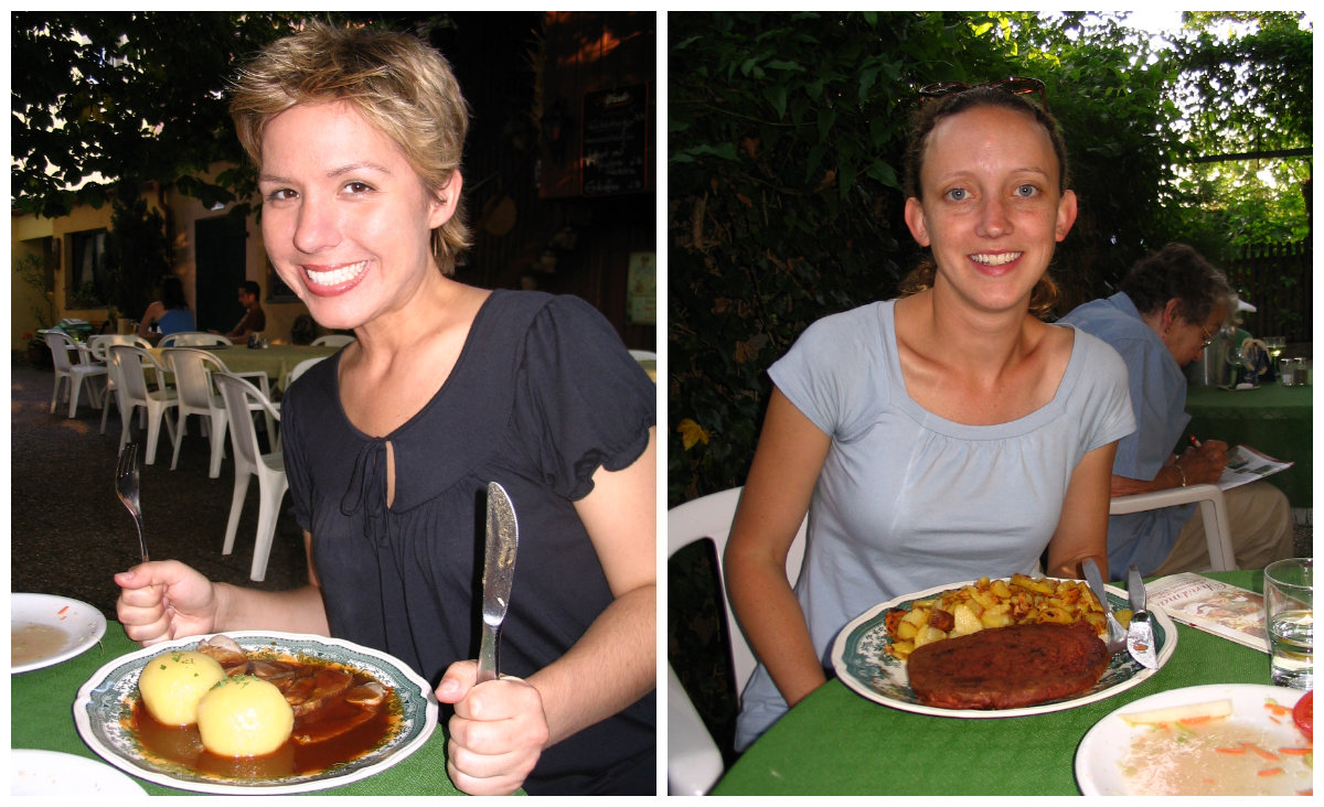 First on the agenda was dinner! The hotel had an on-site restaurant so we decided to eat there, and took a seat at a table in the garden. We each ordered some traditional German dishes: pork roast, potato dumplings and a salad for me, and fried meatloaf (we swear it was a giant piece of bologna), fried potatoes and salad for Teresa.