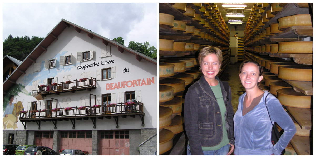 The following day we most deservedly slept in. 🙂 We had a leisurely morning, then decided to venture out again, this time heading to the mountains, and this time taking Goliath with us. 🙂 We drove first to Beaufort and visited the Coopérative Laitière du Beaufortain where we took a tour of the cheese-making facilities. It was very enjoyable although the smell could knock you over in some parts, specifically the “caves” where the cheese is aged. Whew!