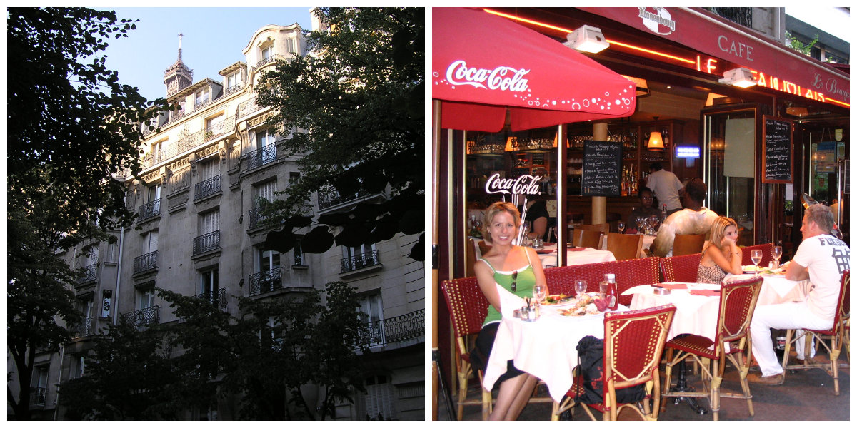 After walking through a few other rooms, we exited the palace and headed to the train station for our ride back into Paris. Once in the city, the first thing on our agenda was to find a place to eat! We had plans to go up the Eiffel Tower so we headed in that direction. We ended up at a little cafe called le Beaujolais with an Eiffel Tower view (see photo below). 🙂