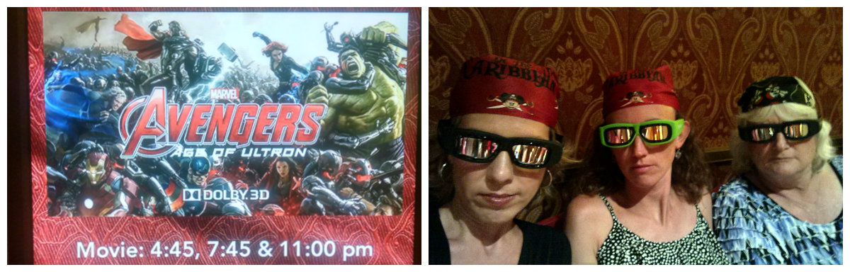 After dinner, we made a bee-line for the Walt Disney Theater where a special screening of Avengers: Age of Ultron was taking place as that evening’s entertainment. We donned our lovely 3-D glasses and enjoyed watching this just-released movie.